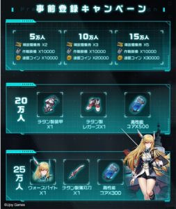 事前登録の累計人数に応じて、ゲーム内アイテムなどを全プレイヤーが貰える。