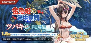 本募集では、EXスキル付きの限定SSR冒険者ツバキ・水着(CV:佐藤聡美)の出現率は同じレアリティの冒険者よりもアップ致します。