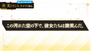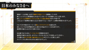 上海散爆(サンボーン)の代表取締役社長兼ドルフロシリーズプロデューサーである羽中氏のメッセージが紹介されました。