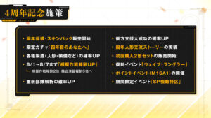 8月1日を皮切りに「周年福袋・スキンパック」「限定ガチャ:四年目のあなたへ」「物資補給箱イベント」などの提供をはじめ、融合勢力の復刻キャラクターや新規の「ネイト(黒)」「アーキテクト-NVW型」を捕獲できる「SP 機動特区」も開催される予定