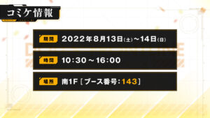 2022年8月13日・14日に開催される「コミックマーケット100」で両日、南1Fに同社のブース(143)が出展される。