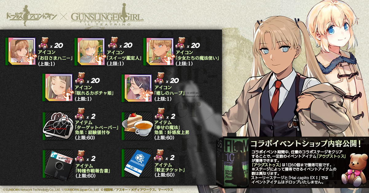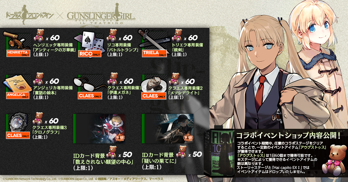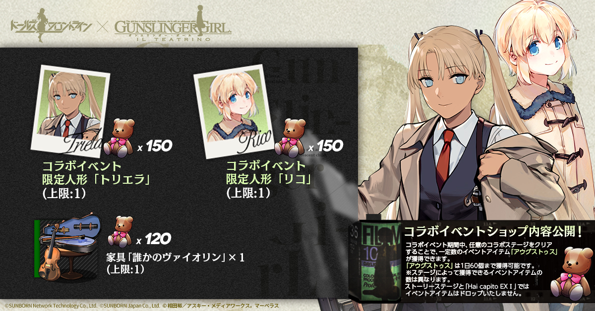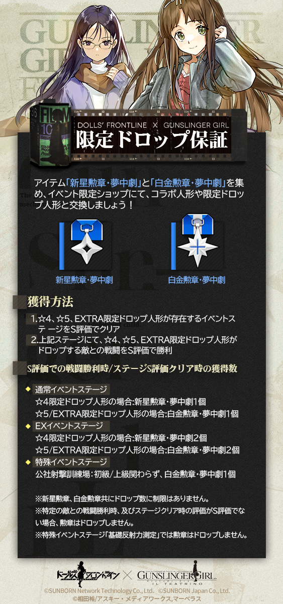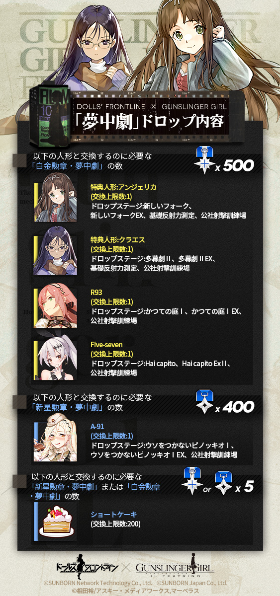 9月11日から始まるドールズフロントライン×ガンスリンガー・ガールズ コラボイベント「夢中劇」のガンスリコラボキャラ紹介と獲得方法の紹介です。