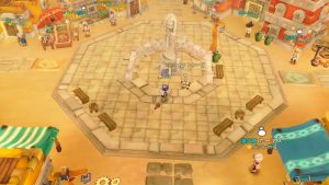 街の中央にある美しい広場には様々な品物を扱う商人たちが露店を広げ、活気にあふれています。