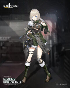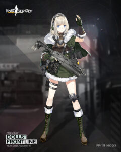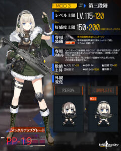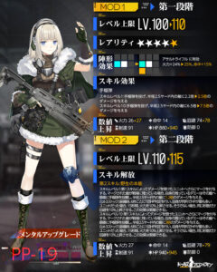ちょっと厚着になった「PP-19」はMOD3になると専用スキルが開放され、専用装備「pt-3ストック」装備時に、自身が同列でHPが最も多い場合は火力上昇、そうでない場合は回避上昇します。