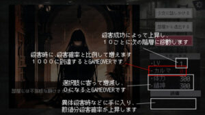 ・選んだ選択肢によってレベル、体力、精神、カルマのパラメーターが変動していき、体力・精神が0、カルマが1000になった場合ゲームオーバーとなります。