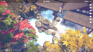日本の温泉のリラックスした雰囲気に浸る放置系の温泉シミュレーションです。プレイヤーは鮮やかな紅葉に優しい光が差し込む山の中で、湯気が立ち昇る趣深い館の温泉をただひたすらに眺めて癒されます。